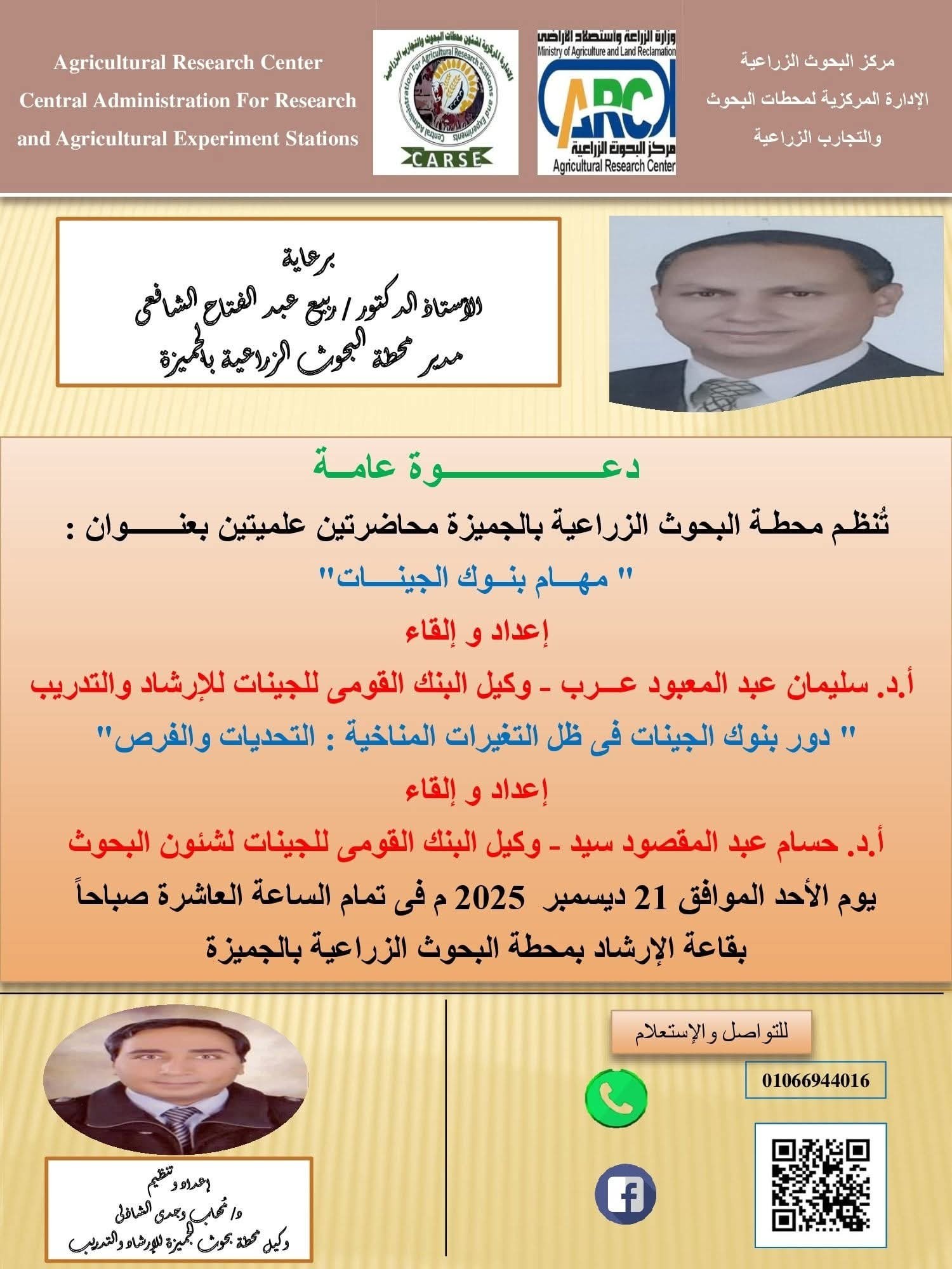 وفقًا لمذكرة التفاهم المبرمة بين إدارة كلية الزراعة جامعة طنطا بقيادة الأستاذ الدكتور/ عيسوي قاسم محمود عميد الكلية ومحطة البحوث الزراعية بالجميزة بقيادة الأستاذ الدكتور/ ربيع عبد الفتاح الشافعي مدير المحطة، وبدعوة كريمة من سيادته مقدمة إلى السادة الباحثين وأعضاء هيئة التدريس والهيئة المعاونة والمهتمين لحضور محاضرتين علميتين؛ تأتي المحاضرة الأولى بعنوان "مهام بنوك الجينات" ويُلقيها الأستاذ الدكتور/ سليمان عبد المعبود عرب وكيل البنك القومي للجينات للإرشاد والتدريب، والمحاضرة الثانية بعنوان "دور بنوك الجينات في ظل التغيرات المناخية.. التحديات والفرص" ويُلقيها الأستاذ الدكتور/ حسام عبد المقصود سيد وكيل البنك القومي للجينات للبحوث.