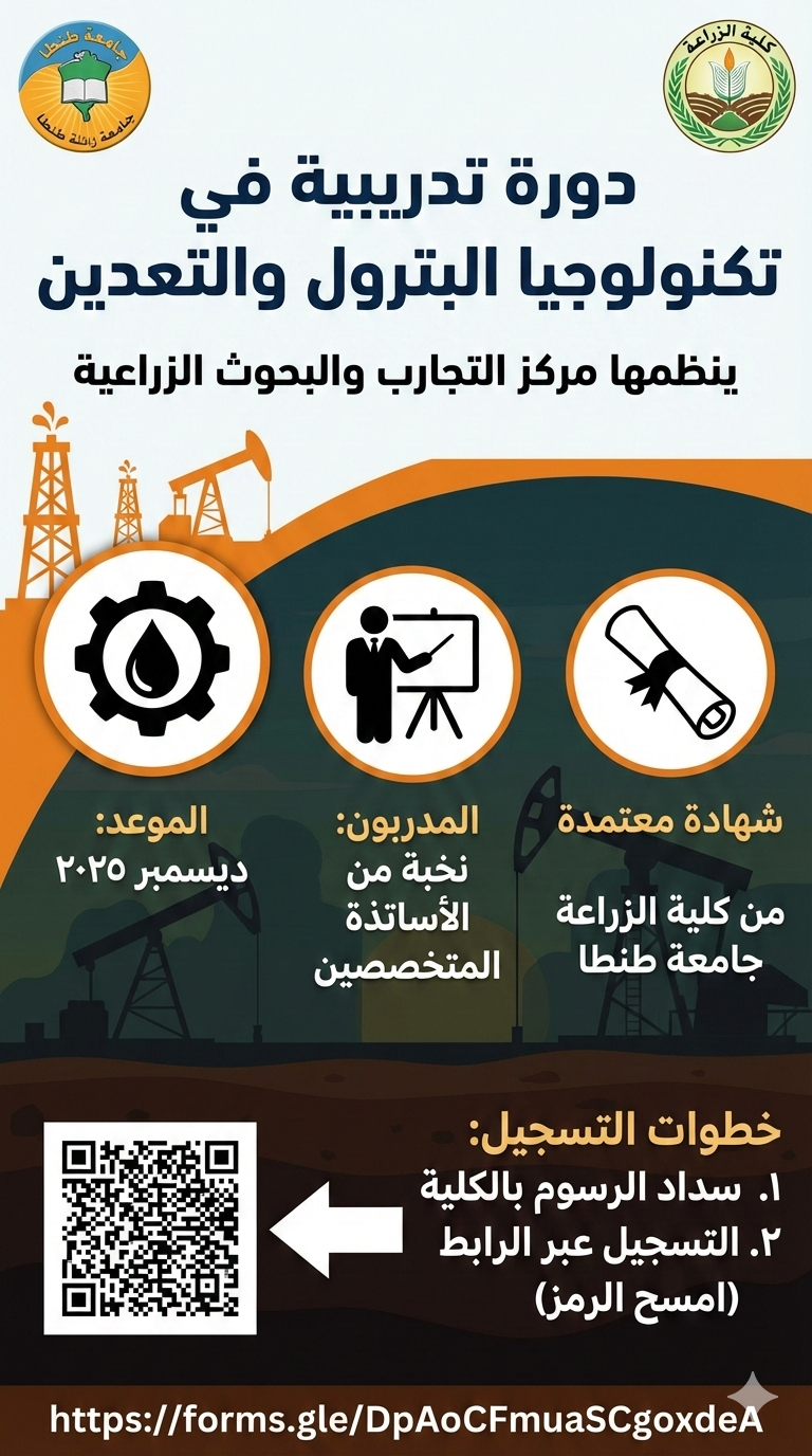 يعلن مركز التجارب والبحوث الزراعية بكلية الزراعة جامعة طنطا عن عقد دورة تدريبية في تكنولوجيا البترول والتعدين، حيث تبدأ الدورة التدريبية خلال شهر ديسمبر ٢٠٢٥، ويقوم بالتدريب نخبة من الأساتذة المتخصصين في هذا المجال، ويحصل المتدرب في نهاية الدورة على شهادة معتمدة من كلية الزراعة جامعة طنطا. ولإتمام عملية التقدم للدورة، يتم سداد الرسوم المقررة بمقر كلية الزراعة، ثم التسجيل عبر الرابط التالي: